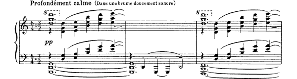 This piece is based on an ancient Breton myth in which a cathedral, submerged underwater off the coast of the Island of Ys, rises up from the sea on clear mornings when the water is transparent. Sounds can be heard of priests chanting, bells chiming, and the organ playing, from across the sea.[